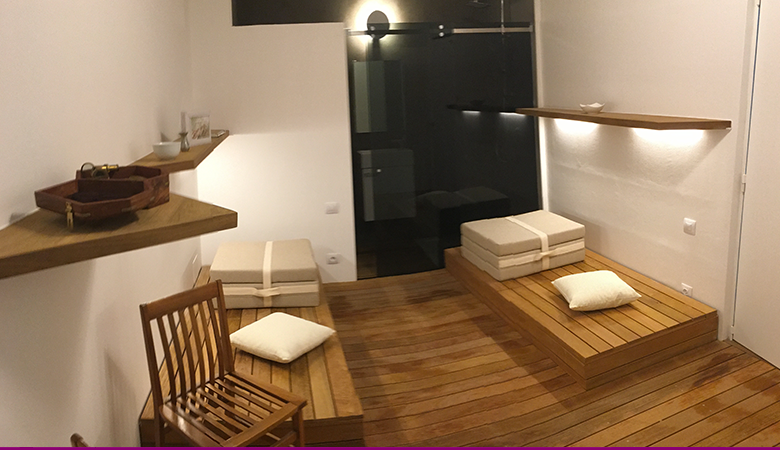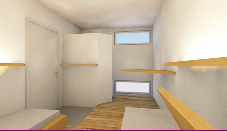 Grazie alle due grandi panche/contenitore incassate nel pavimento in doghe di legno, la stanza si trasforma all'occorrenza in camera da letto appoggiandovi i due futon aperti. Le mensole contengono le strip led che illuminano le postazioni letto. Il pavimento sopraelevato alloggia l'impianto idraulico che alimenta il piccolo bagno annesso. A sinistra dell'ingresso una parete con anta mobile cela il minuscolo locale lavanderia.
