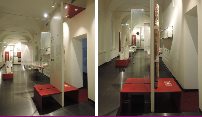 Una tripla lastra di vetro, quella interna forata per contenere il medaglione e le monete, le due esterne a chiusura, della consente di vedere entrambe le facce dei reperti. Inserita nel prolungamento del basamento della Groma e separata dal pannello cui questa si appoggia, la lastra sottolinea l'importanza del reperto attraverso una collocazione insolita.